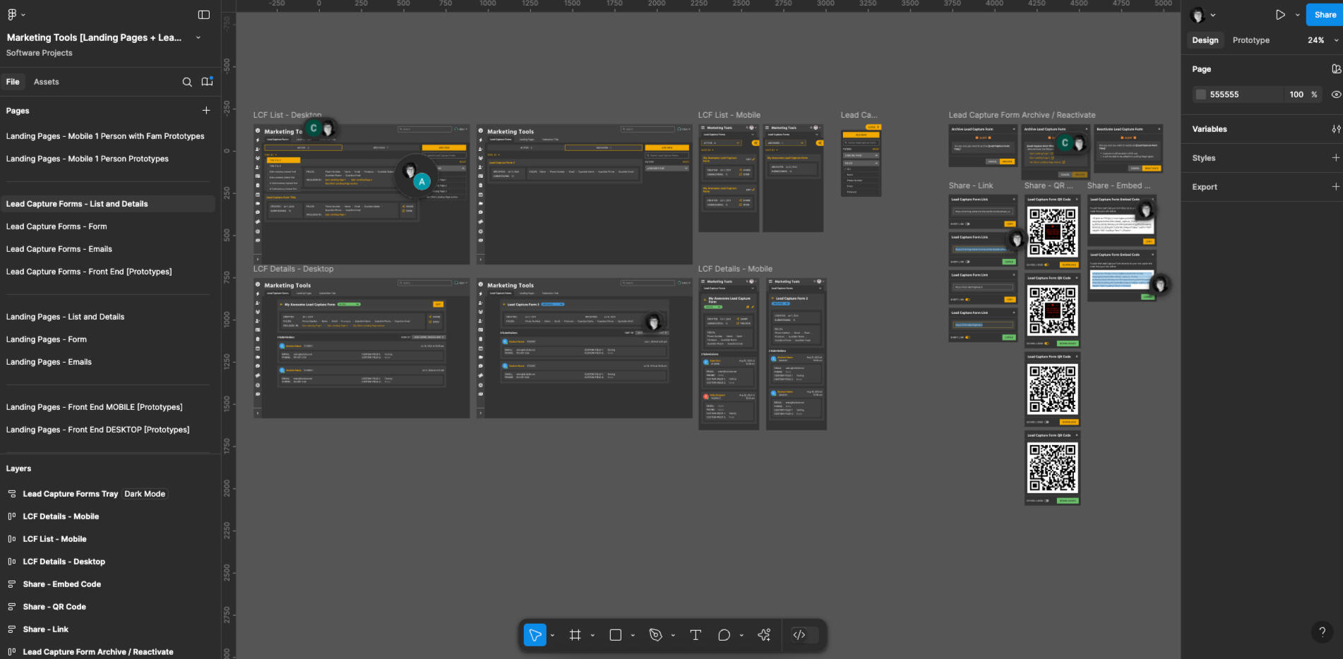 Just one page of the Figma document. This is the Lead Capture Form list, as well as actions that can be taken from the list. All mocks were created with Auto Layout and the design system component library.