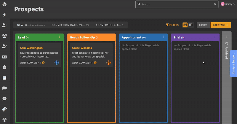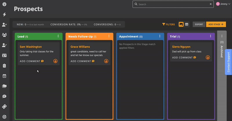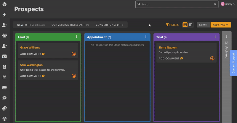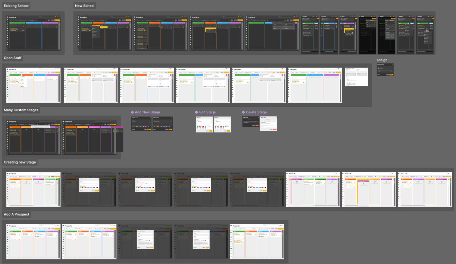 Kicksite has several profile types – Student, Contact, Family, Employee, and Prospect. Prospects are people who will (hopefully!) become full time Students, but aren't sure yet. They're usually on Trial Memberships.By mid-2025, the Prospect List hadn't been updated since its initial uplift. It was okay, but the rest of the Lists for the other profile types were already completed or underway. It was time to improve, and we had years of feedback to pull from.The main improvement we sought with this uplift was greater interactivity, as well as better visualization of WHERE Prospects were. Many other software (not just CRMs) use a pipeline-type view, so we adapted that to our needs. We moved from just a list view to having two separate views: a Kanban board where Prospects could be moved around as cards, and a Table view for an experience closer to what the List was before.As always, work was done in Figma, using my design system and Auto Layout for fully responsive mocks. I also created the customer-facing documentation for the uplift, which can be found here.